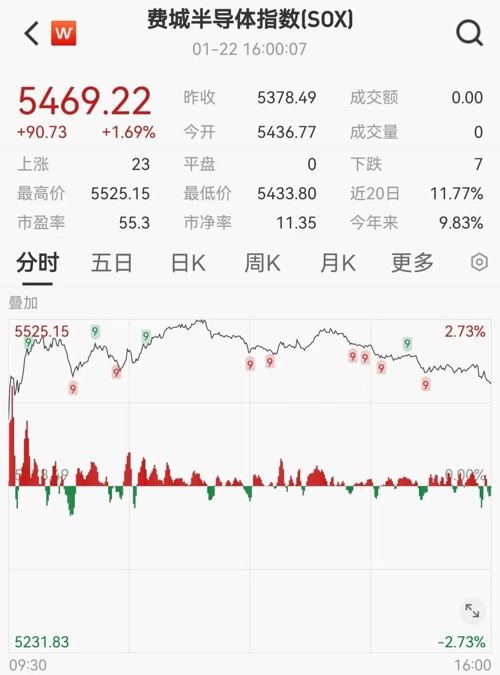 特朗普宣布人工智能项目利好人工智能及半导体产业。芯片股普遍上涨,费城半导体指数一度大涨2.73%,随后涨幅收窄,全天涨1.69%。