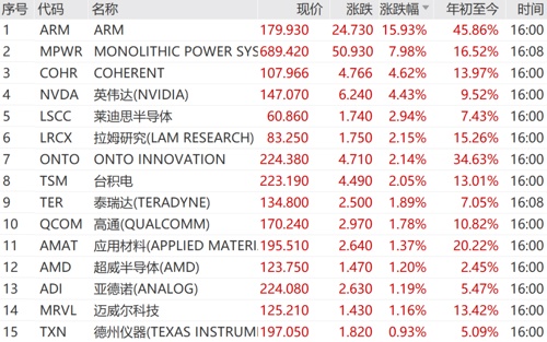 个股方面,ARM涨15.93%,英伟达涨4.43%,拉姆研究涨2.15%,台积电涨2.05%。