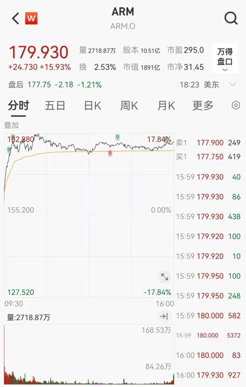 美东时间1月22日,ARM股价开盘直线拉升,最高涨幅达17.84%,全天收于179.93美元,涨15.93%。
