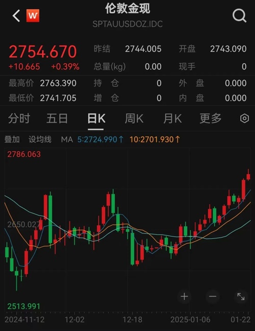 1月22日,国际金价持续走强,伦敦金现盘中涨至2763.39美元,创2024年11月以来新高。