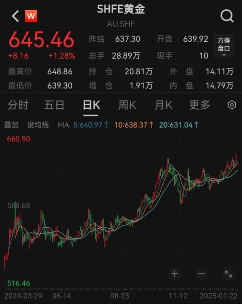 自2025年开年以来,金价虽然偶有回调,但是整体呈现上涨趋势,国内金价比国际金价涨势更为明显。1月17日,沪金创出历史新高,盘中最高上冲至643.92元/克,超越2024年10月30日641.81元/克的历史高点。仅过了五天,沪金再次刷新纪录,1月22日,沪金主力合约升破645元/克。