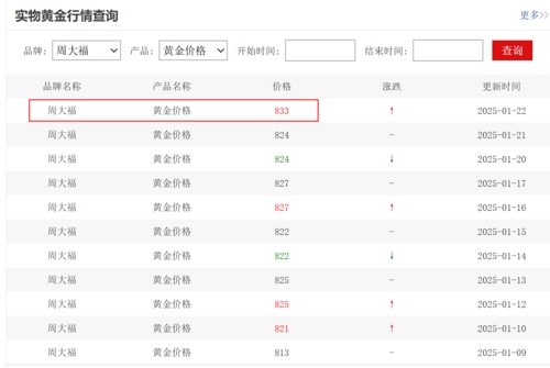 在终端消费市场上,周大福等品牌金店的足金饰品1月22日报价为每克833元,也创出新高,相较于1月21日跳涨8元/克。老凤祥、周六福和周生生等品牌足金价格也均突破830元/克。