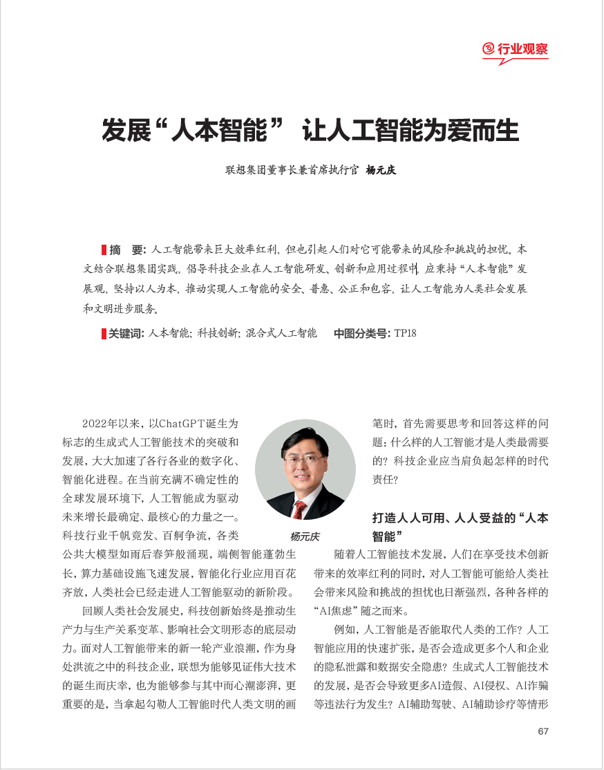 杨元庆在文中表示,人们在享受人工智能带来的效率红利、工作和生活越来越依赖于人工智能的同时,各种各样的“AI焦虑”随之而来。如何趋利避害,在推动人工智能提升生产力的同时,有效控制风险,实现人工智能的安全、普惠、公正和包容,打造人人可用、人人受益的“人本智能”,这是科技企业应该努力的方向,也是联想一直在努力追求的目标。