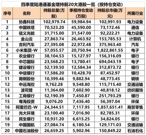 按照持股变动情况排序,加仓幅度最大的前十只港股为协鑫科技、中国铁塔、信义光能、金山云、吉利汽车、小米集团-W、农业银行、中芯国际、建设银行、中信银行,涵盖通信、电力设备、计算机、汽车、电子、银行等行业。