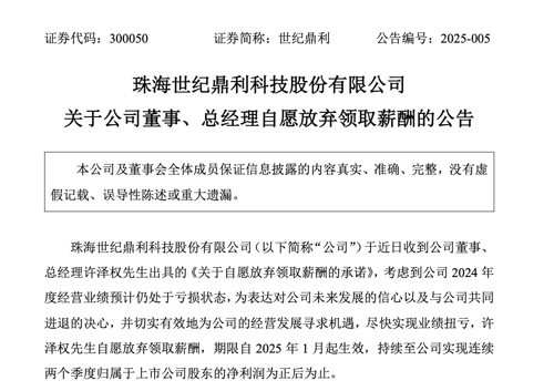 【导读】世纪鼎利总经理自愿放弃领取薪酬,至公司连续两个季度赚钱为止1月23日,世纪鼎利发布公告称,公司总经理许泽权已提交承诺书,自愿放弃领取薪酬。公告显示,世纪鼎利于近日收到公司董事、总经理许泽权出具的《关于自愿放弃领取薪酬的承诺》,考虑到公司2024年度经营业绩预计仍处于亏损状态,为表达对公司未来发展的信心以及与公司共同进退的决心,并切实有效地为公司的经营发展寻求机遇,尽快实现业绩扭亏,许泽权自愿放弃领取薪酬,期限自2025年1月起生效,持续至公司实现连续两个季度归属于上市公司股东的净利润为正后为止。简历信息显示,许泽权出生于1980年,他曾在广东省微波通信局及广州市欧康通信技术有限公司从事技术及生产管理工作,2003年参与创办广州市贝讯通信技术有限公司并担任总经理。2013年11月至2023年1月,他出任世纪鼎利副总经理;2019年4月至2021年3月,任公司财务总监;2016年4月起,任公司董事会秘书;2020年1月起,任公司董事;2023年1月起,任公司总经理。2023年度,许泽权从公司获得的税前报酬总额为78.26万元,相对2022年减少了13.81万元。世纪鼎利表示,许泽权承诺将继续秉持初心,根据相关法律法规的规定认真履行各项职责,恪尽职守,勤勉尽责,积极维护公司及全体股东的利益,推动公司持续、稳定、健康发展。世纪鼎利成立于2001年,2010年1月在创业板上市。公司主营业务包括通信及物联网、职业教育。业绩方面,2021年至2023年,公司归母净利润连续为负值,合计净亏损额超19亿元。1月20日披露的业绩预告显示,预计2024年公司净亏损6600万元至9800万元,与上年同期相比亏损额有所收窄;营业收入为2.3亿元至3.3亿元,较上年同期有所减少。对于业绩变动的原因,世纪鼎利表示,一是由于2023年度对合并报表范围内的部分子公司进行剥离,2024年度整体的收入规模较上年同期有所减少。二是报告期内,公司通过加大费用管控力度,裁撤人员,优化资金的使用结构等方式,整体的期间费用同比下降。三是报告期内,公司预计对各类资产计提的减值金额较上年同期大幅减少。四是非经常性损益的影响,报告期内,预计公司的非经常性损益对归属于上市公司股东的净利润影响金额约为-450万元。在最新公告中,世纪鼎利称,公司将以现有主业为基础,沿着新质生产力的方向,在持续加大成本控制力度的基础上,积极对外拓展合作,以全面提升公司的运营效率与市场竞争力,最终实现经营业绩与盈利能力的显著提升。截至1月23日,世纪鼎利报5.1元/股,公司市值为28亿元。