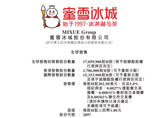 【导读】蜜雪冰城计划于3月3日在港交所主板挂牌上市,每股发售价为202.50港元。今年2月,新茶饮赛道企业赴港上市进程提速。上周,古茗在港交所主板挂牌上市的热度还未消散,今天蜜雪冰城上市的最新消息又来了。2月21日,蜜雪冰城股份有限公司(以下简称蜜雪冰城)正式披露全球发售公告,宣布公司将于2月21日至2月26日招股,计划于3月3日在港交所主板挂牌上市。这也意味着,平均单价约6元、超46000家门店、一年出售约90亿杯的全球最大现制饮品企业“雪王”,即将登陆港交所与投资者见面。公告显示,蜜雪冰城计划全球发售1705.99万股H股(视超额配股权行使情况而定),其中国际发售股份数量约为1535.39万股,相当于全球发售项下初步可供认购的发售股份的90%;香港发售股份数量约为170.60万股,相当于全球发售项下初步可供认购的发售股份的10%。每股发售价为202.50港元。香港公开发售已于今日上午9点拉开帷幕,并将于2月26日(星期三)中午12点截止,香港公开发售的申请水平及发售股份的分配基准预计不迟于2月28日(星期五)公布。蜜雪冰城预计,公司将于2025年3月3日(星期一)上午9点开始在港交所主板正式交易,股份代号确定为2097。如果以当前确定的发售价每股发售股份202.5港元计算,扣除全球发售支付的包销费用及佣金及其他估计发售开支后,蜜雪冰城预计将收取全球发售所得款项净额约32.91亿港元。蜜雪冰城透露,公司计划将此次全球发售所得款项净额约66%或21.72亿港元用于提升端到端供应链的广度和深度。例如,公司计划通过建造新设施并改造和扩建现有设施以扩大公司在中国的产能;约12%或3.95亿港元用于品牌和IP的建设和推广;约12%或3.95亿港元用于加强各个业务环节的数字化和智能化能力;约10%或3.29亿港元用于营运资金和其他一般企业用途。蜜雪冰城此次发行已经获得不少基石投资者认购,包括红杉中国、高瓴在内的5名基石投资者,共认购2亿美元(约15.58亿港元)。无论是从门店数、终端零售额,还是饮品出杯量计算,蜜雪冰城都是中国最大现制饮品企业,因强大的品牌IP形象和领先的市占率及独特的商业模式,蜜雪冰城时常被投资者称为“雪王”。蜜雪冰城的产品线包括现制果饮、茶饮、冰淇凌和咖啡等。根据灼识咨询的报告,按照截至2024年9月30日的门店数计,蜜雪冰城是中国及全球最大的现制饮品企业;按照2023年的饮品出杯量计,蜜雪冰城是中国第一、全球第二的现制饮品企业;按照2023年的终端零售额计,蜜雪冰城亦是中国第一、全球第四的现制饮品企业,蜜雪冰城在中国及全球的市场份额分别约为11.3%及2.2%。2月21日,记者通过外卖方式购买北京一家蜜雪冰城门店的主推饮品,购买一杯冰鲜柠檬水、一杯奶茶、一杯咖啡合计价格为16元左右(包含用户配送费、打包费)。根据灼识资讯数据,以终端零售额计,全球现制饮品市场2023年至2028年的复合年增长率预计将提高至7.2%。中国现制饮品市场的规模预计在2028年达到约11634亿元人民币,2023年至2028年的复合年增长率为17.6%。其中,平价现制饮品(单价不高于10元人民币)不但满足了消费者愈加追求性价比的大趋势,而且在与其他平价饮料产品近似的价格带下提供了更新鲜的产品和互动性更强的消费体验。因此,平价现制饮品在不同价格带的现制饮品细分市场中增速最高,2023年至2028年的复合年增长率预计达到22.2%。招股书显示,截至2024年12月31日,蜜雪冰城拥有46479家门店,2024年,蜜雪冰城共实现饮品出杯量约90亿杯,实现了约583亿元的终端零售额,分别同比增长21.9%及21.7%。蜜雪冰城预计,年度公司拥有人应占合计利润不少于44亿元人民币(合约48亿港元)。在商业模式上,蜜雪冰城是超级供应链企业。德邦证券表示,蜜雪冰城在国内外均采用统一加盟方案,不参与经营抽成,业务本质可定义为供应链生意,原材料销售额贡献主要利润。2024年前三季度,公司整体收入中商品销售收入占比94.29%,其余为设备销售、加盟和相关服务收入。“你爱我,我爱你,蜜雪冰城甜蜜蜜......”蜜雪冰城通过一首简单易记的歌曲,强化了品牌形象和传播品牌理念,“雪王”IP广为流传。如今,蜜雪冰城港股上市在即,蜜雪冰城能否持续管理好庞大的门店网络运营绩效,在品牌价值、食品安全、供应链体系方面保持领先地位,值得市场持续关注。
