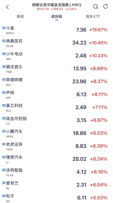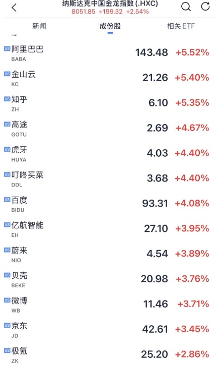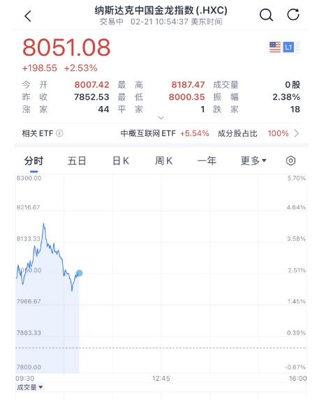 2月21日晚间,美股开盘之后,中概股指数的代表——纳斯达克金龙指数,继续大涨超2%!