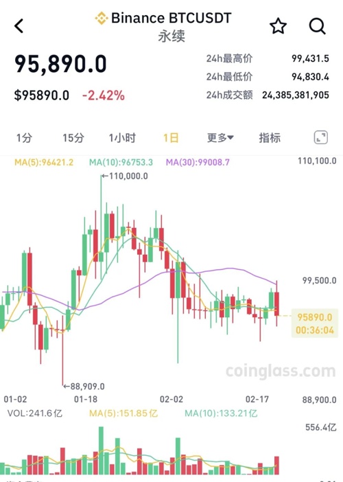 【导读】加密货币资产被盗,比特币跌破95000美元/枚,加密货币市场价格集体重挫。2月22日凌晨,加密货币市场集体走跌,比特币出现多次短时急跌,24小时内跌破95000美元/枚,最低探至94830.3美元/枚。最近24小时,全球超17万人爆仓。消息面上,北京时间2月21日晚间,加密货币交易平台Bybit被黑客入侵,攻击规模巨大,总资产价值超过15亿美元的逾40万ETH和stETH被转移至未知地址。此次突发的资产被盗事件,对行业造成沉重打击。据CoinGlass行情数据,过去几个小时,比特币价格持续走低,一度下探94830.3美元/枚附近。截至记者发稿,比特币报95890美元/枚,跌幅达2.42%。除比特币之外,当日加密货币市场其他货币也集体暴跌。以太坊、币安币、狗狗币、SOL币、瑞波币、艾达币、SUI币、TRUMP币全线大跌。狗狗币、TRUMP币、艾达币、瑞波币、SUI币跌超4%,以太坊、SOL币跌超3%。