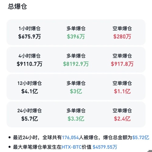 CoinGlass数据显示,最近24小时内,加密货币市场爆仓人数达17万人,爆仓总金额达5.72亿美元。其中,多单爆仓金额达到3.3亿美元,空单爆仓金额达到2.4亿美元。最大单笔爆仓单发生在HTX-BTC,价值为4579.55万美元。
