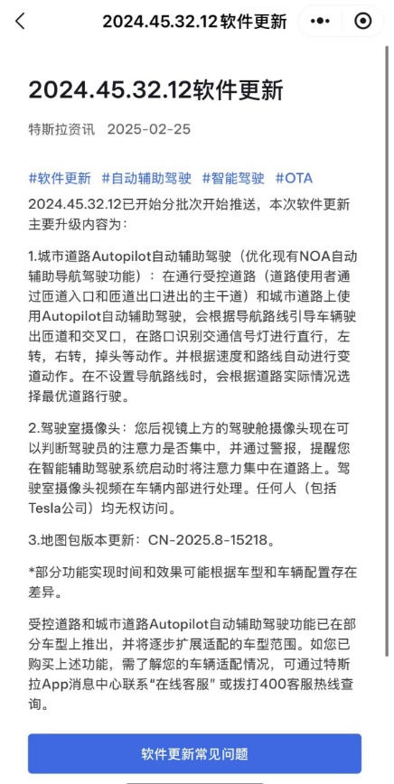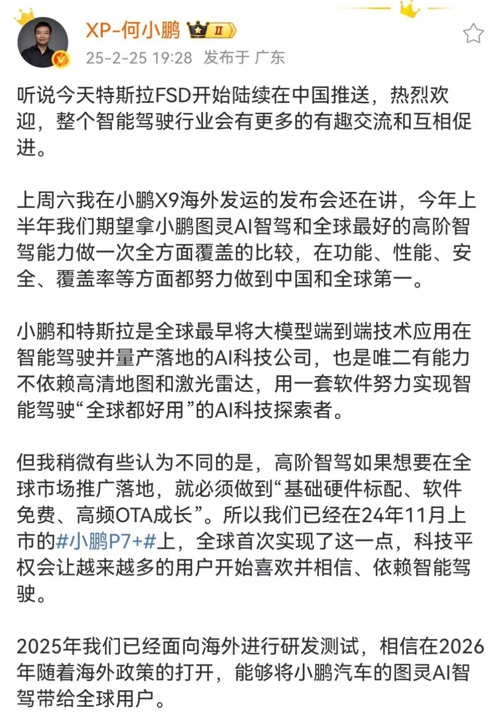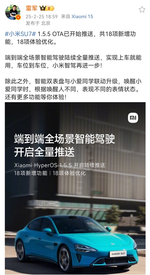 2月25日晚间,小米创办人、董事长兼CEO雷军发布微博称:“小米SU7 1.5.5 OTA已经开始推送,新增18项功能,18项体验优化。”同一天,特斯拉发布消息称,特斯拉将为中国客户分批次更新软件,上线城市道路Autopilot(自动驾驶仪)自动辅助驾驶等功能。小米汽车海报显示,小米SU7 1.5.5 OTA的推送时间自2月25日起。“车位到车位,小米智驾再进一步。”雷军称,端到端全场景智能驾驶陆续全量推送,可实现上车就能用。据悉,小米汽车的端到端全场景智能驾驶,支持在完成路线学习的停车场,实现车位到车位的全场景智驾体验,覆盖高速公路、城市快速路、复杂城市道路以及停车场等场景。总体来看,车辆从停车位启动到驶入公共道路,直至目标停车场智能泊车为止,全程可实现无缝衔接。在小米智能座舱方面,智能双表盘与小爱同学联动升级。据雷军介绍,唤醒小爱同学时,根据唤醒人不同会出现不同的表情状态,还有更多功能有待体验。其中,小米智能座舱提升了第三方超充桩的充电性能,新增蔚来的部分充电桩即插即充功能(可通过充电桩“即插即充”标签识别),实现无感充电。截至2月25日收盘,小米集团股价报53.20港元/股,涨幅为3.1%,总市值为1.34万亿港元。2月25日,特斯拉发布资讯显示,特斯拉将为中国客户分批次更新软件,包括推出城市道路Autopilot自动辅助驾驶功能,优化了现有NOA自动辅助导航驾驶功能。据悉,车辆在通行受控道路(道路使用者通过匝道入口和匝道出口进出的主干道)和城市道路上,Autopilot自动辅助驾驶功能可根据导航路线,引导车辆驶出匝道和交叉口,在路口识别交通信号灯,进行直行、左转、右转、掉头等动作。同时,Autopilot自动辅助驾驶会根据速度和路线自动进行变道动作,在不设置导航路线时,会根据道路实际情况选择最优道路行驶。2月24日晚间,有消息称,特斯拉正准备为中国用户进行软件更新,以提供类似美国市场上FSD的驾驶辅助功能。FSD全称为Full-Self Driving,中文名称为完全自动驾驶,系特斯拉研发的自动驾驶系统。此前,特斯拉CEO埃隆·马斯克称,特斯拉将在欧洲和中国申请监管批准,以实施监督下的FSD。2月25日晚间,小鹏汽车董事长何小鹏发布微博称:“听说今天特斯拉FSD开始陆续在中国推送。热烈欢迎,整个智能驾驶行业会有更多有趣的交流和互相促进。”中金公司研报指出,2025年有望成为智驾从量到质的发展大年,可以关注的两条主线:一是从L2+功能的逐步完备,到开启L3车企竞争新篇章;二是特斯拉FSD入华和Robotaxi(无人驾驶出租车)带来的双重潜在正向催化。近日,何小鹏对外称,2025年上半年,小鹏汽车希望将小鹏图灵AI智驾对比全球最好的高阶智驾能力,在功能、性能、安全、覆盖率等方面都努力做到中国和全球第一。何小鹏表示,小鹏汽车和特斯拉是全球最早将大模型端到端技术应用在智驾并量产落地的AI科技公司,也是唯二有能力不依赖高清地图和激光雷达,可以用一套软件努力实现智驾“全球都好用”的AI科技探索者。何小鹏提出,高阶智驾如果要在全球市场推广落地,必须做到“基础硬件标配、软件免费、高频OTA成长”。2025年,小鹏汽车已经面向海外进行研发测试。何小鹏认为,相信在2026年随着海外政策打开,能够将小鹏汽车的图灵AI智驾带给全球用户。