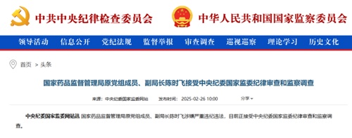 中央纪委国家监委网站2月26日消息,国家药品监督管理局原党组成员、副局长陈时飞涉嫌严重违纪违法,目前正接受中央纪委国家监委纪律审查和监察调查。