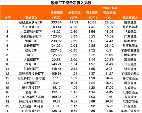 另据Wind统计,资金净流入前20大的股票ETF中,港股相关ETF占据6席,以互联网、科技、创新药等方向为主。前20大ETF合计吸引资金净流入近20亿元。