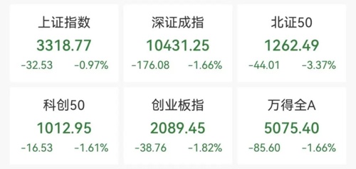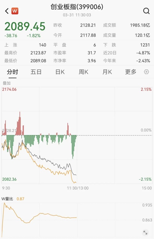 3月31日,A股三大指数震荡下探,截至午间收盘,沪指跌0.97%,深成指跌1.66%,创业板指跌1.82%。