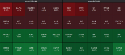 从板块来看,电力板块逆市拉升,银行股震荡走高,次新股表现活跃;而机器人板块集体走低,工业母机、工业机械、航天军工等板块跌幅居前。