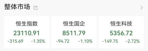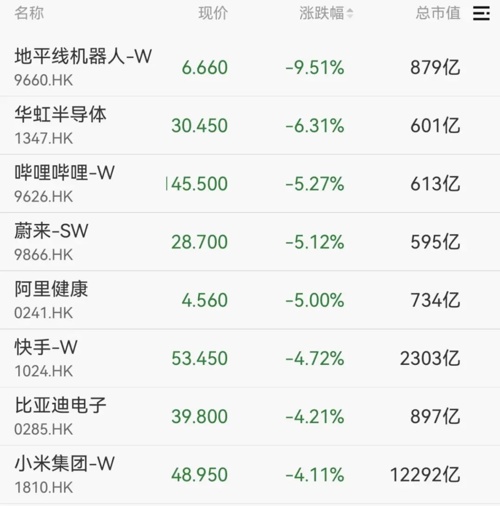 港股方面,恒生科技指数跌超2%,地平线机器人、华虹半导体、哔哩哔哩、蔚来等跌超5%。
