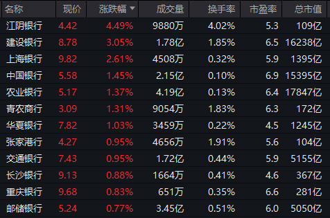 银行股震荡上涨,江阴银行、建设银行涨超3%,上海银行、中国银行、农业银行等跟涨。
