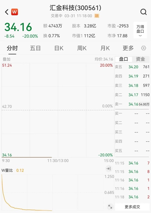 汇金科技开盘20CM跌停,54万手封死跌停板。截至发稿,汇金科技报34.16元/股,总市值为112亿元。