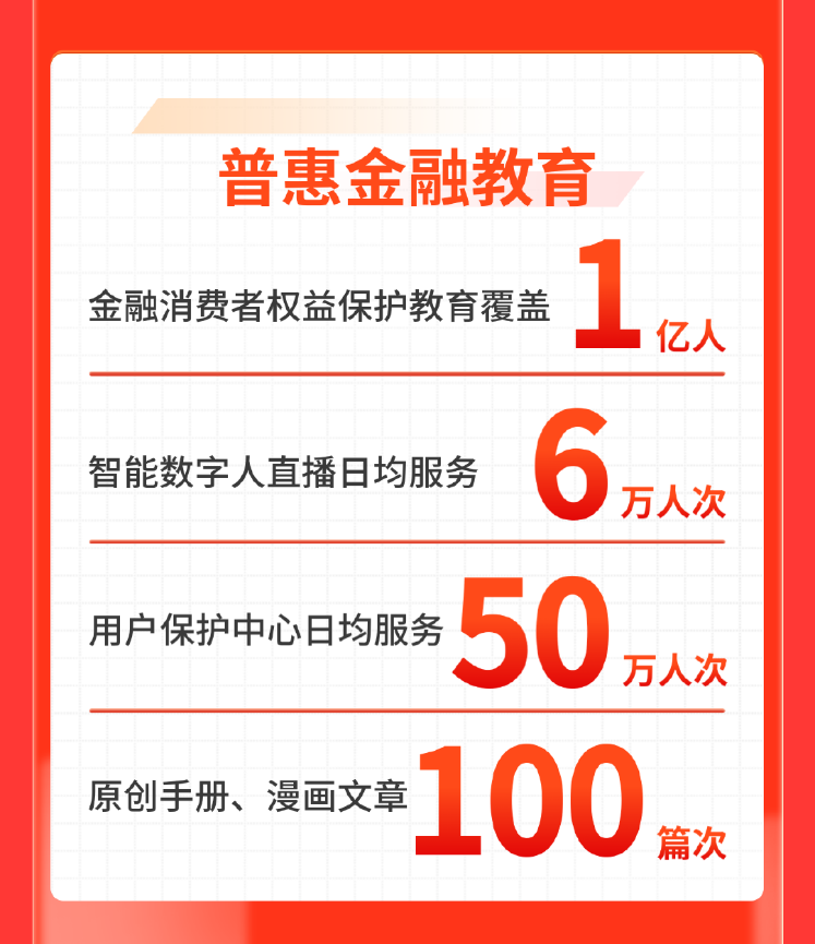 在与公安部门携手筑牢安全防线的同时,京东金融积极在线上线下开展普惠金融教育工作。报告显示,2024年京东金融消保教育覆盖人群达到了 1 亿人,通过多样化的消保知识,让更多消费者能够 “看得懂、学得会、用得上”,增强自身的金融风险防范能力;京东金融强化用户保护中心的服务功能,为消费者提供了便捷的权益保护渠道,增强了消费者在金融消费过程中的安全感与信任感,日均服务 50 万人次。此外还创新服务形式,利用智能数字人直播,日均服务 6 万人次,服务满意度超90%,使金融教育更加有趣易懂,有效提高了消费者对金融知识的接受度。