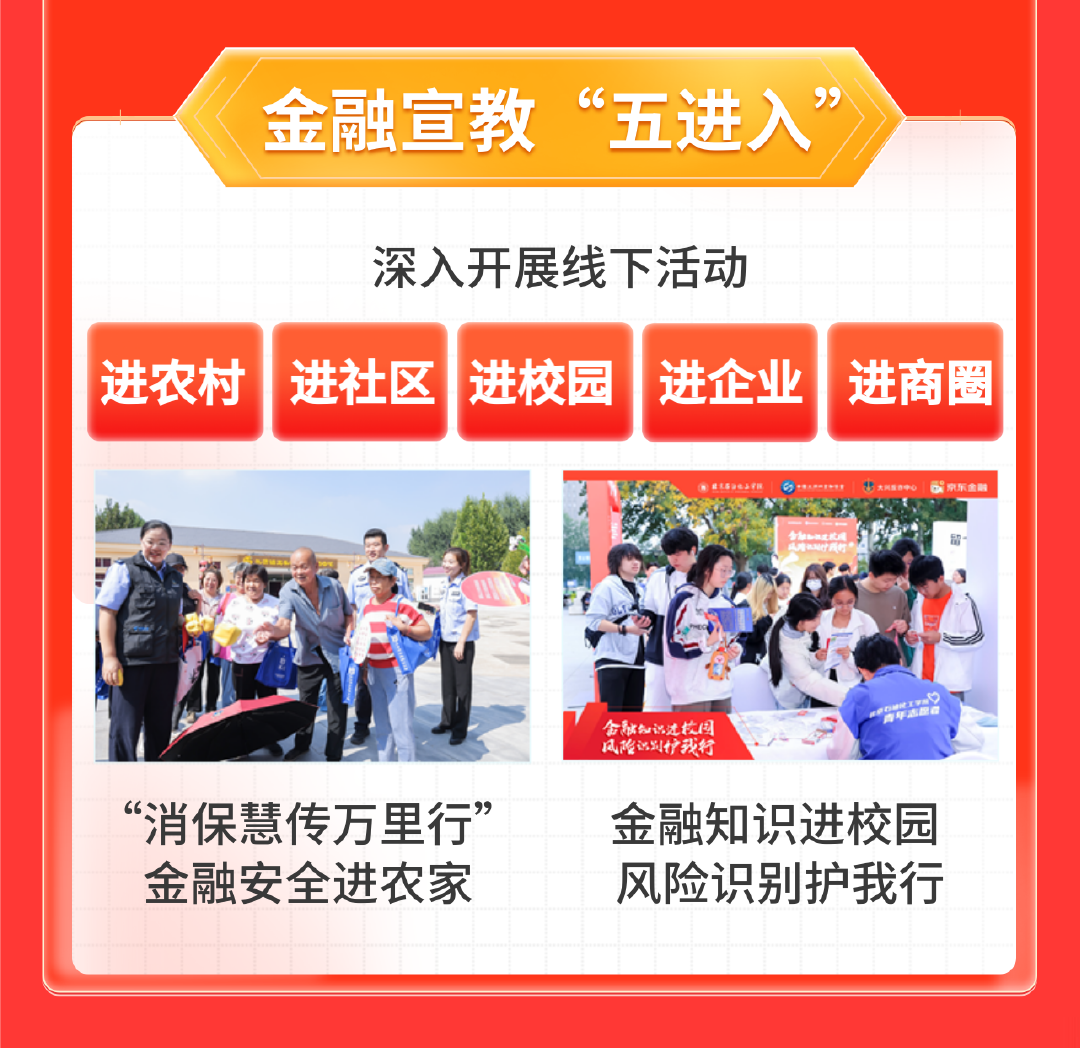 为了进一步扩大金融知识普及范围,京东金融在线下多场景深入开展金融宣教 “五进入” 活动,组织工作人员走进农村、社区、校园、企业、商圈等场所,将金融安全知识和风险识别技巧传递给更多消费者;并加强与协会、学校、金融机构、反诈中心等各方合作,积极探索创新金融教育模式。