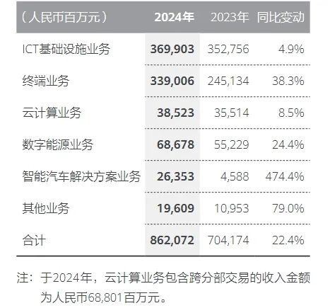 具体来看,年报显示,2024年,华为ICT基础设施业务、终端业务、云计算业务、数字能源业务、智能汽车解决方案业务以及其他业务分别实现营收3699.03亿元、3390亿元、385.23亿元、686.78亿元、263.53亿元、196.09亿元,同比分别增长4.9%、38.3%、8.5%、24.4%、474.4%、79%,总营收同比2023年增长22.4%。
