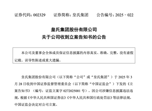 【导读】皇氏集团涉嫌信披违法违规,被证监会立案