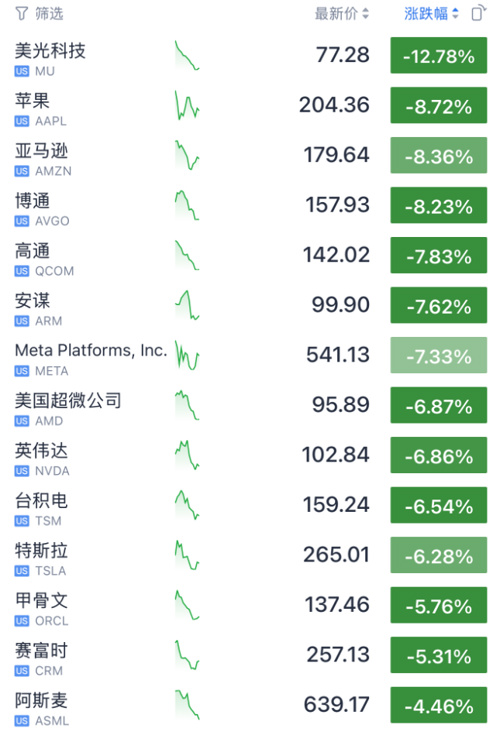 跨国公司股价大幅下跌,耐克下跌12%,苹果下跌8%。大量依赖进口商品的公司遭遇重创,Five Below大跌29%,Dollar Tree下跌8%,Gap暴跌22%。在整体避险情绪下,科技股同样大幅下滑,英伟达下跌6%,特斯拉下跌6%。