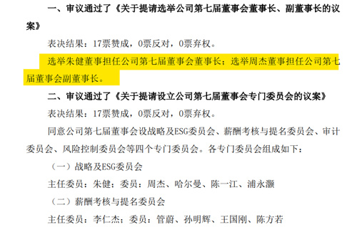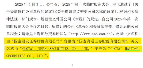 4月3日晚间,正式完成更名的国泰海通发布首份公告,官宣公司董事长、副董事长、总裁及高管名单,并明确了新的公司组织架构。根据公告,领导班子方面,选举朱健担任公司董事长、周杰担任副董事长,聘任李俊杰为公司总裁。组织架构方面,国泰海通设立了财富管理、研究与机构业务、投资银行业务、固定收益业务、权益业务、信用业务、金融科技等7个业务或管理委员会,设置了41个总部部门。公告显示,股东大会选举了17名董事,包括内部董事3名,为朱健、李俊杰、聂小刚;股东董事8名,为周杰、管蔚、钟茂军、陈航标、吕春芳、哈尔曼、孙明辉、陈一江;独立董事6名,为李仁杰、王国刚、浦永灏、毛付根、陈方若、江宪。股东大会选举产生的董事将与后续职代会选举产生的职工董事共同组成国泰海通第七届董事会。股东大会后,国泰海通第七届董事会召开了第一次会议,选举朱健担任公司董事长、周杰担任副董事长,聘任李俊杰为公司总裁,毛宇星、谢乐斌、罗东原、聂小刚、潘光韬、张信军、陈忠义、韩志达为公司副总裁,聂小刚兼任公司首席风险官、董事会秘书,张信军兼任公司首席财务官,赵宏为公司总审计师,俞枫为公司首席信息官,赵慧文为公司合规总监、总法律顾问。有业内人士分析,国泰海通领导班子最大程度融合了国泰君安、海通证券原有班底,将有利于文化传承、队伍稳定、整合融合,更快释放“1+1>2”协同效应。上海国际集团董事长周杰曾较长时间担任海通证券主要负责人,此次作为股东董事兼任国泰海通副董事长,有利于保持业务及人员稳定,也体现了大股东对国泰海通的赋能支持。此外,据知情人士透露,本次合并中有许多从基层长期历练成长起来的年轻干部得以重用,彰显了国泰海通务实专业、市场化年轻化的用人导向,以及大刀阔斧、干事创业的坚定决心。在充分考虑国泰君安与海通证券原有组织架构,吸收借鉴双方特色优势的基础上,国泰海通进一步优化了公司组织架构。根据公告,国泰海通设立了财富管理、研究与机构业务、投资银行业务、固定收益业务、权益业务、信用业务、金融科技等7个业务或管理委员会,设置了41个总部部门。整合后有上海、浙江、北京、深圳、广东、江苏等44家分公司。各类子公司将在过渡期内并行运作。“新的组织架构致力于构建强大前台、专业中台和集约后台,全面提升公司客户服务能力和综合实力。”接近国泰海通的人士分析表示,在强大前台方面,客户部门着力强化客需导向的综合化入口功能,高效整合集团各中台资源,输出专业化、定制化的业务解决方案;在专业中台方面,中台部门围绕产品、服务、功能、平台等维度打造专业能力,定位为全公司的公共能力中心,全面赋能零售、企业、机构三大客户服务体系建设;在集约后台方面,进一步突出集约共享,破除行政化导向,实现各类资源高效布局投入。公告显示,经公司2025年第一次临时股东大会审议通过,公司中文名称由“国泰君安证券股份有限公司”变更为“国泰海通证券股份有限公司”,英文名称由“GUOTAI JUNAN SECURITIES CO., LTD”变更为“GUOTAI HAITONG SECURITIES CO., LTD”。公司已于4月3日完成公司名称、注册资本等事项的市场主体变更登记手续,取得了新的《营业执照》,后续将向上交所及香港联交所申请变更公司A股、H股证券简称。另据悉,公司已经取得了新的《经营证券期货业务许可证》,保障了业务经营无缝衔接。在公司LOGO方面,因短期内尚未形成满意方案、标识注册需要较长时间等因素,为确保品牌形象延续,国泰海通目前沿用了国泰君安的钻石品牌标识(LOGO)。后续,国泰海通将构建新战略、塑造新文化,届时将听取各方意见,适时择机推进包括品牌形象在内的企业文化规划。
