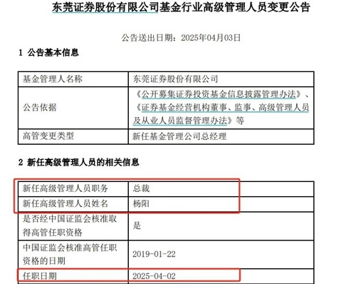 业内表示,杨阳加盟东莞证券,正值该公司加速布局公募基金业务之际,这一战略性契合或为其出任公司总经理的重要因素。