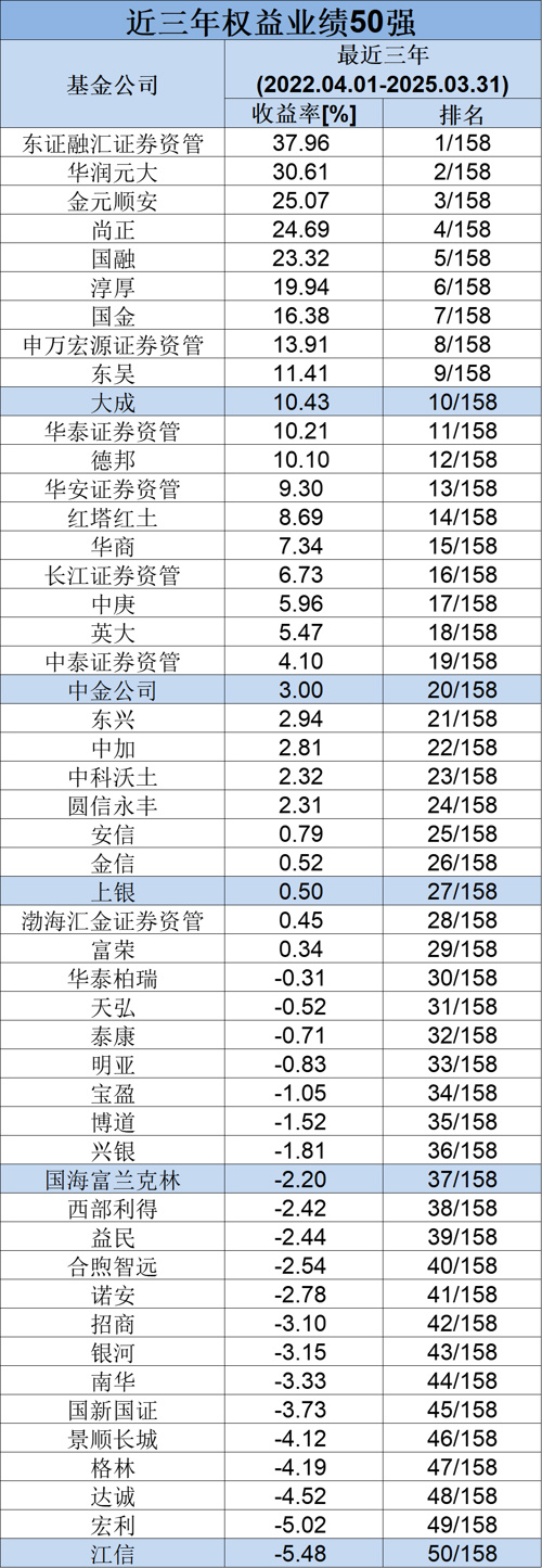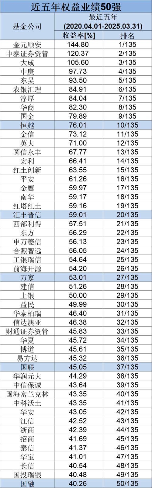2025年第二季度已然开启!又到了总结基金公司一季度主动权益投资业绩的时刻。市场永远都存在不确定性,涨涨跌跌本是常态,投资的目的是穿越牛熊获得稳健收益。最近10年牛熊交替中,哪些基金公司跑在前列?大中型基金公司中谁能独占鳌头?最近5年市场风格变化较大,哪些公司能够快速反应,踏对市场节奏?最近3年市场调整之下,哪些公司抗风险能力更强?一季度哪些公司表现更为亮眼?海通证券日前发布基金公司权益类基金绝对收益排行榜,揭晓上述谜底。A股市场波动大,10年对于基金经理来说是很大的考验。10年业绩是验证基金公司长期投资能力的最重要指标之一,值得每位投资者重视。2014年开启一直演绎到2015年的成长股牛市中,上证指数创下历史第二高峰5178点。然而,2015年下半年市场由牛转熊,急剧调整,2016年一度出现熔断。不过,2017年市场迎来一轮反弹行情,价值投资崭露头角,一大批龙头股表现出色。经历2018年的低迷后,2019年、2020年市场呈现结构性牛市,消费、医药和科技等黄金赛道表现不俗。2021年,市场波动加大,新能源、光伏等板块表现出色。然而,在内外部不利因素影响下,2022年开始市场持续调整,直到2024年9月24日一系列超预期政策推动下,市场出现暴涨行情。这一波行情一直延续到2025年,尤其春节之后,AI、人形机器人、创新药等主题轮番表现,带动市场走强。在这10年的市场起伏中,一批基金公司把握市场机遇取得了不错的业绩。海通证券数据显示,2015年4月1日至2025年3月31日期间,万家基金旗下权益类基金平均净值增长率达到214.95%,在纳入统计的77家基金公司中排名第一,也是唯一一家近10年收益率超过200%的基金公司。东方证券资管紧随其后,以132.09%的收益率排名第二,交银施罗德基金以130.96%的收益率位列第三;前十名还包括平安基金、红塔红土基金、浙商基金、圆信永丰基金、中欧基金、大成基金、银河基金,这些基金公司权益类基金整体收益率均超过110%。海通证券专门设置了权益类基金大型基金公司、中型基金公司和小型基金公司绝对收益排行榜。近10年业绩显示,大中型基金公司平均收益率要高于小型基金公司。数据显示,13家大型基金公司和10家中型基金公司近10年平均收益率分别为78.82%、89.22%,小型基金公司为50.4%,说明大中型基金公司凭借较强的投研实力,能更及时地把握市场机遇获取较好收益,“马太效应”明显。近5年A股市场经历了一次由熊转牛的变迁,业绩领先的管理人通常是能够在熊市中抗跌、牛市里抓住机遇的优秀长跑者。5年的中长期业绩非常受投资者关注。海通证券数据显示,从2020年4月1日到2025年3月31日5年间,金元顺安基金权益类基金平均收益率达到144.8%,在纳入统计的135家基金公司中排名第一,中泰证券资管以120.37%的收益率位居第二,大成基金以105.6%的收益率位居第三。这3家公司近5年的权益类基金业绩超过100%。此外,中庚基金、东吴基金、农银汇理基金、淳厚基金、华商基金也表现不错,近5年收益率均超过80%。这些基金公司旗下都有业绩出色的基金经理,如中泰证券资管的姜诚、大成基金的刘旭、已离职的华商基金周海栋、已离职的中庚基金丘栋荣等。数据显示,大型、中型、小型基金公司近5年平均收益率分别为30.41%、45.97%、33.84%。整体来看,在震荡市场环境下,中型基金公司更能及时地把握市场机遇获取较好收益,表现出较好的抗跌能力。不过,近5年有11家小型基金公司权益类基金收益率为负,亏损幅度最大达到52.81%。3年期业绩也是颇受市场关注的一个指标。近3年来,A股市场波动较大,这对基金公司的投研和风控能力都是很大的挑战。海通证券数据显示,2022年4月1日到2025年3月31日3年间,东证融汇证券资管旗下权益类基金平均收益率为37.96%,在纳入统计的158家管理人中排名第一,位居第二和第三的分别是华润元大基金、金元顺安基金,旗下权益类基金平均收益率分别为30.61%、25.07%,尚正基金、国融基金等基金公司同期收益率也超过20%。此外,淳厚基金、国金基金、申万宏源证券资管、东吴基金、大成基金、中泰证券资管、德邦基金等旗下权益类基金近3年绝对回报也超过10%,显示出较好的中期投资能力。从基金公司规模来看,13家大型基金公司近3年收益率平均值为-11.16%,10家中型基金公司为-5.54%,纳入统计的135家小型基金公司这一业绩数据为-10.77%。显然,中型基金公司业绩相对表现更好。大型基金公司中,景顺长城、易方达、兴证全球、交银施罗德等近3年业绩较好。2024年“9·24”行情以来,A股市场出现震荡回暖行情。今年春节后,DeepSeek横空出世、人形机器人火爆全网,科技股表现神勇,港股市场明显回暖,领涨全球。一季度主流指数涨跌不一,北证50指数一季度涨幅达到22.48%,是表现最好的主流指数;中证2000指数、中证1000指数、科创50指数分别上涨7.08%、4.51%、3.42%,红利指数则小幅下跌。受益于基础市场走好,公募基金表现较好。海通证券数据显示,一季度,171家基金公司中仅22家未能获得正收益,就意味着约87%的公司获得了正收益。今年一季度表现最好的是百嘉基金,业绩达到13.85%,华西基金和弘毅远方基金收益率也超过10%,分别为12.86%、11.02%。此外,路博迈、同泰、淳厚、永赢等基金公司业绩也较好,这些公司旗下均有一季度业绩领先的产品。制作:小茉