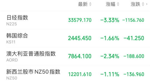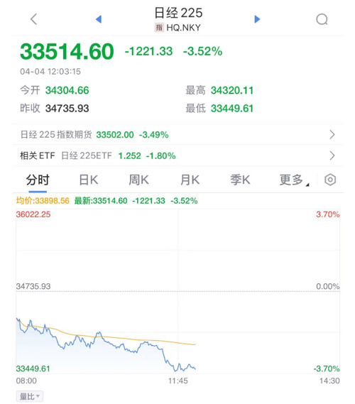 4月4日,亚太市场集体下挫,跌至两个月以来的最低点,延续了全球股市的抛售潮,日经225指数跌超1200点,跌幅超3.5%。韩国综合指数跌超1.6%。在澳大利亚市场,S&P/ASX 200指数跌幅已经扩大至2.04%。此外,泰国股指下跌超2%。