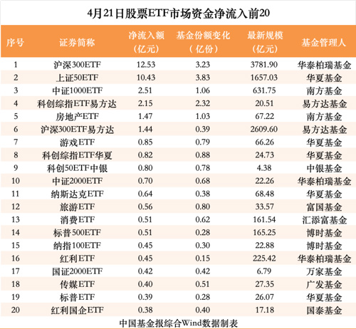 另据华夏基金测算,4月21日,沪深300指数ETF单日资金净流入居前,达12.14亿元;从5个交易日角度观测,沪深300指数ETF资金净流入超389亿元,上证50指数ETF资金净流入超94亿元。