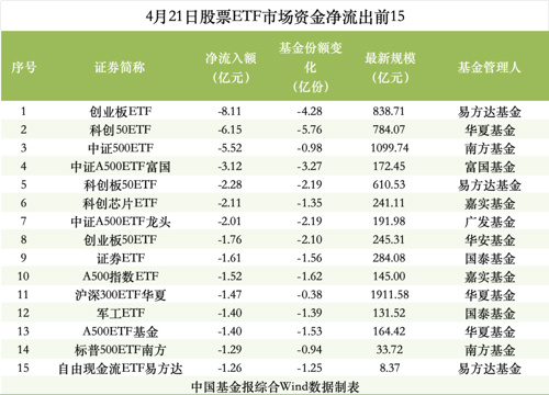 【导读】4月21日股票ETF资金净流出超30亿元
