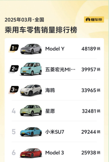 第三方资讯平台懂车帝数据显示,2024年12月,Model 3在中国市场的零售月度销量首次被小米SU7超越。2025年3月,Model 3、小米SU7的销量分别为25938辆、29244辆。