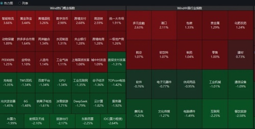 从板块来看,黄金股延续强势,统一大市场、物流概念股集体走强,跨境支付概念股再度震荡走高,农药、化肥概念股表现活跃。下跌方面,旅游股回调,算力、影视、6G、AI应用、消费电子、机器人、光伏等题材走弱。