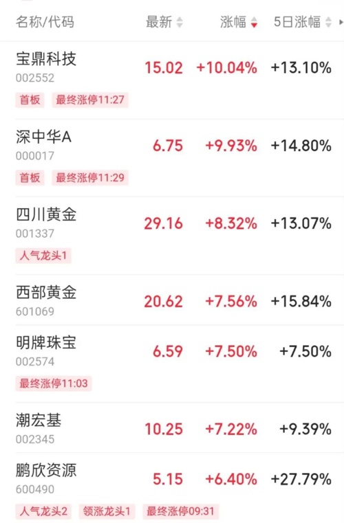 明牌珠宝一度涨停,午盘最终上涨7.5%。截至午间收盘,四川黄金涨超8%,鹏欣资源、西部黄金、潮宏基涨超7%,洛阳钼业、鹏欣资源、萃华珠宝等涨超4%。