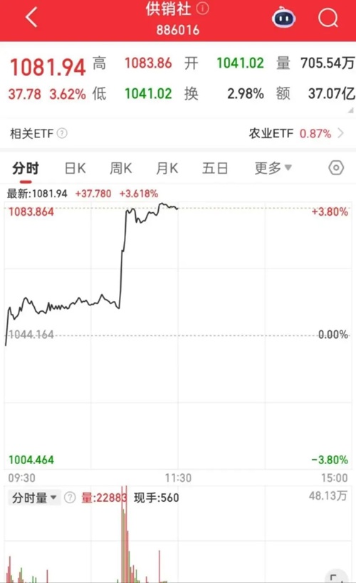 供销社概念股盘中突然拉升,供销社指数半日上涨3.62%。