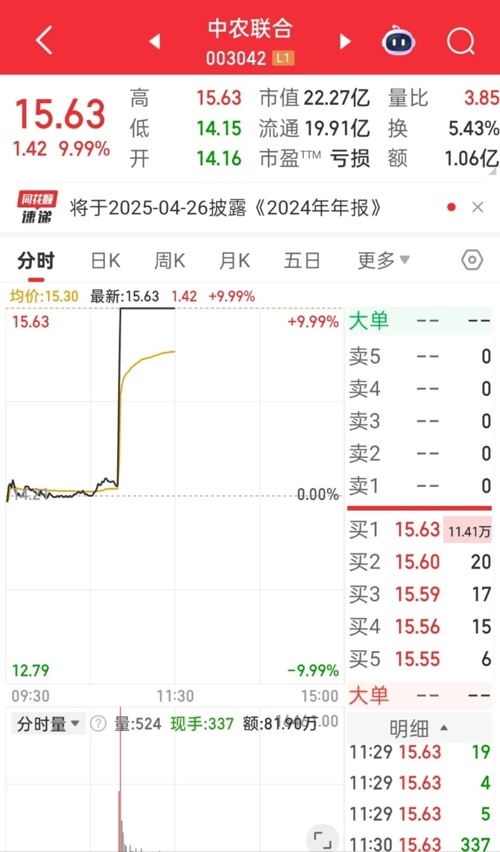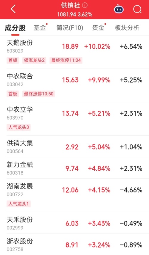 中农联合、天鹅股份双双直线涨停。中农立华、供销大集、湖南发展、天禾股份等多股跟涨。