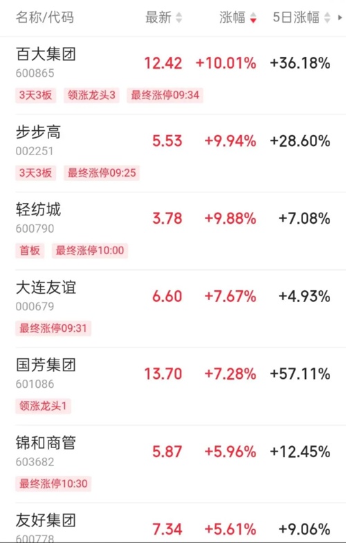 此外,零售股走高,百大集团涨停,步步高绩后一字涨停,均实现三连板,轻纺城盘中快速拉升涨停。