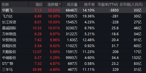 统一大市场、物流概念股集体走强,华鹏飞20cm涨停,长江投资、嘉诚国际、万林物流、华贸物流、保税科技等多股涨停。