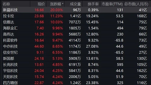 此外,跨境支付概念股再度走强,新晨科技20cm涨停,信雅达、海联金汇、中油资本涨停,拉卡拉涨超11%,高伟达、科蓝软件、中亦科技等纷纷大涨。