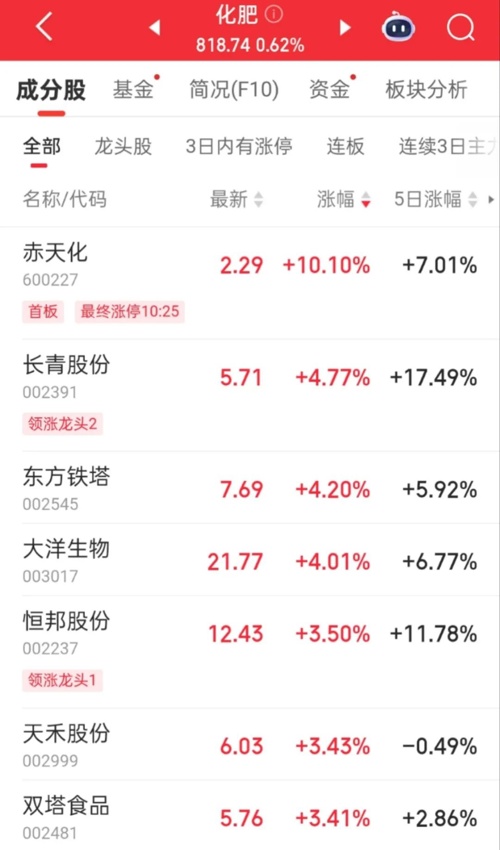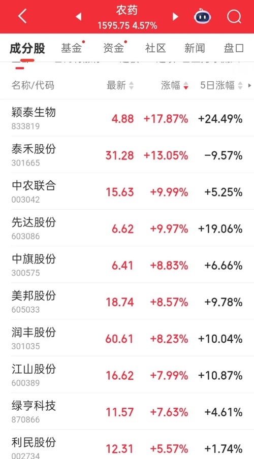 A股市场农药、化肥概念股震荡拉升。其中,中农联合、赤天化、先达股份涨停,颖泰生物涨超10%,江山股份、中旗股份、美邦股份、绿亨科技、润丰股份涨超5%。