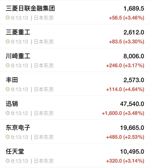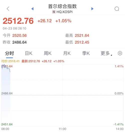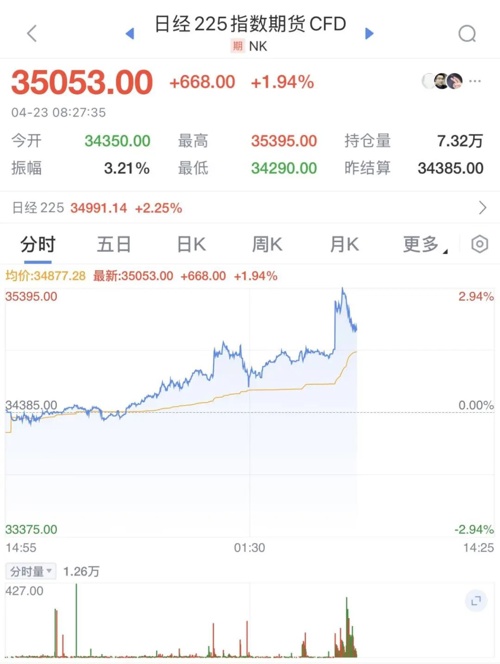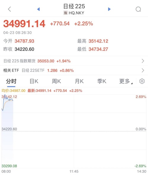 隔夜美股大幅收涨,日韩股市集体高开。一起来看下日韩股市的最新情况及资讯。4月23日早间,日韩股市高开,日经225指数早盘快速拉升,截至发稿,日经225指数涨2.25%,报34991.14点。个股方面,日本汽车股、银行股大幅走高,三菱日联金融集团、三菱重工、丰田、瑞穗金融集团均涨超3%。韩国股市同样高开,韩国KOSPI指数开盘上涨1.4%,至2520.56点。消息面上,韩国产业部部长表示,一直在为各种非关税讨论做准备,将与美国同行讨论贸易失衡问题。现货黄金开盘急挫,短线跌幅扩大至逾60美元,现报3347美元/盎司。因黄金价格大幅波动,“黄金巨震”的话题于早间冲上热搜第一。消息面上,据央视新闻报道,当地时间4月22日,美国总统特朗普称美联储应降低利率,且无意解雇美联储主席鲍威尔。此外,特朗普还表示,希望鲍威尔在利率问题上采取更加积极的行动。鲍威尔表示,美联储不会屈从政治压力,面对特朗普政府近期关税政策带来的复杂经济局面,美联储将重点考虑对抗通货膨胀。