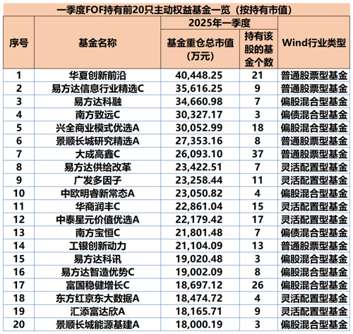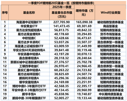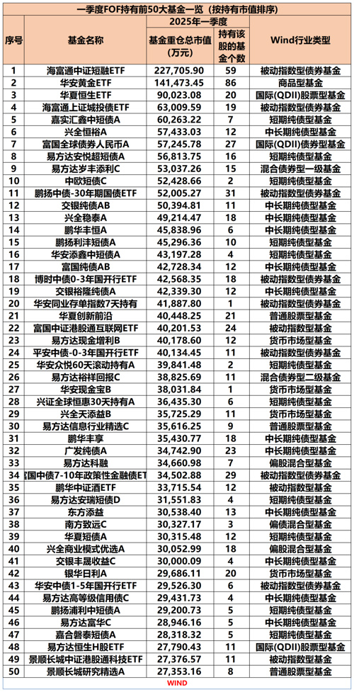 【导读】“专业买手”出手了,公募FOF最新重仓基金曝光! 随着基金2025年一季报披露完毕,有着“专业买手”之称的公募FOF最新重仓基金情况浮出水面。从一季报披露的情况来看,FOF重仓债券型基金最多,占比过半;ETF也是公募FOF增持和配置的重点。一季度FOF最爱的5只基金分别为海富通中证短融ETF、华安黄金ETF、华夏恒生ETF、海富通上证城投债ETF、嘉实汇鑫中短债A。Wind数据显示,公募FOF一季度末重仓的前50大基金中,债券型基金最多,数量达33只,占比过半。值得注意的是,伴随指数投资时代加速到来,ETF产品“弯道超车”,成为FOF重仓的基金种类。截至一季度末,海富通中证短融ETF被FOF合计持有市值超22.77亿元,被59只FOF持有,成为FOF持有市值最高的基金产品。 紧随其后的是华安黄金ETF、华夏恒生ETF,一季度FOF对这两只产品的持有市值分别为14.15亿元、9亿元。此外,嘉实汇鑫中短债A、兴全恒裕A、富国全球债券人民币A、易方达安悦超短债A、易方达岁丰添利C、中欧短债C等债券型基金,截至一季度末,FOF对这些基金的持有市值均超5亿元。作为“专业买手”,FOF基金经理对主动权益类基金(包括混合型基金、股票型基金)的配置情况受到市场关注。Wind数据显示,截至一季度末,华夏创新前沿被21只FOF持有,合计持仓市值达4.04亿元,位居一季度FOF持有主动权益类基金之首(按持有市值)。紧随其后的是易方达信息行业精选C,被9只FOF持有,合计持仓市值达3.56亿元。此外,易方达科融、南方致远C、兴全商业模式优选A等也被不少FOF重仓持有,公募FOF对这些产品的持仓市值均超3亿元。相比之下,增持基金更能反映出FOF基金经理对未来市场的看法。Wind数据显示,从增持市值数据来看,一季度被FOF增持最多的基金为海富通中证短融ETF,该基金一季度被FOF增持16.51亿元,持有市值达22.77亿元。紧随其后的是华安黄金ETF,该基金在一季度被FOF增持6.93亿元,持有市值达14.15亿元。此外,易方达安悦超短债A、易方达现金增利B、中欧短债C、易方达岁丰添利C、海富通上证城投债ETF、华安众悦60天滚动持有A、华安添鑫中短债A等也被FOF增持较多,增持市值均超3亿元。 一季报中,多位绩优FOF基金经理表达了对A股后市的信心,在操作层面,“稳中求进、分散多元、多资产、多策略”成为关键词。中欧预见养老2035(三年)基金经理桑磊表示,今年一季度仍然坚持长期资产配置策略,面对A股市场低位区间和震荡环境,保持定力和乐观预期,积极配置、坚定持有,同时在市场的波动中,对部分主动权益基金以及行业板块配置进行了小幅调整,降低了港股相关基金的配置,增加了消费相关基金的配置。其他资产方面,小幅降低了转债基金的配置,小幅提升了主要投资海外市场债券的香港互认基金的配置,继续小幅参与REITs的配置。 兴全安泰平衡养老基金经理林国怀表示,一季度在资产配置上,组合逢低增加了权益资产的配置,维持权益资产的配置比例略高于配置中枢,保持商品基金的适度配置比例;在权益资产风格配置上,组合降低了偏价值型基金的配置比例,同步增加了成长型基金的配置比例;固定收益资产上,组合继续采用海外债券型互认基金、货币市场基金等替换组合中的纯债型基金,并适度降低了转债基金的配置比例;其他方面还包括根据AH折溢价率的变化,适度降低了港股基金的配置比例,进行再平衡;继续根据既定策略积极参与定增、折价品种等套利投资。林国怀指出,目前组合权益部分的风格相对均衡略偏成长,将保持一贯的“略偏左侧”和“适度均衡”的配置策略,通过积极挖掘市场上相对收益和绝对收益的投资机会不断增厚组合收益,通过“多资产、多策略”的方式来平滑组合波动。广发积极回报3个月持有基金经理曹建文表示,一季度,该基金保持了较高的权益仓位,持仓主要以指数基金和ETF为主。结构上,配置的板块和行业适度分散,主要增持了军工、医药等盈利较为稳定、估值相对合理的板块,以及部分含境外权益资产的ETF品种,以实现组合收益来源的多元化。嘉实养老2050(五年)基金经理唐棠表示,组合配置角度,在价值反转和动量趋势两套打法的支持下,通过自上而下的分析进行了大类资产配置调整。在微观角度,根据不同策略的胜率以及隐含赔率,对组合做了微调,季末减仓了微盘策略,增加了景气策略等。