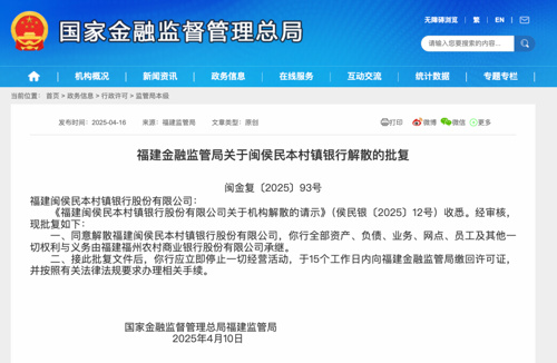 近日,金融监管总局发布的行政许可信息显示,闽侯民本村镇银行已于日前获批解散。批复文件显示,福建金融监管局于4月10日同意解散闽侯民本村镇银行,该行全部资产、负债、业务、网点、员工及其他一切权利与义务,由福州农商银行承继。福建金融监管局表示,闽侯民本村镇银行接此批复文件后,应立即停止一切经营活动,于15个工作日内缴回许可证,并按照有关法律法规要求办理相关手续。今年1月22日,福州农商银行获准吸收合并闽侯民本村镇银行,并承接其清产核资后的资产、负债、业务和员工。资料显示,福州农商银行前身是成立于1951年的福州城区农村信用社,于2011年1月完成股份制改革。2012年,福州农商银行作为主发起行,在闽侯县创立福州第一家村镇银行闽侯民本村镇银行。根据此前披露的数据,截至2023年末,闽侯民本村镇银行资产总额为15.26亿元,不良贷款率为1.65%,拨备覆盖率为297.46%,资本充足率为21.80%。福州农商银行方面,2024年,该行实现营业收入23.51亿元,同比减少1.88%;利润总额为0.98亿元,同比减少6.48%。截至2024年12月末,其总资产达634.04亿元,较上年末增长4.58%,不良贷款率为2.61%,拨备覆盖率为154.03%。 近年来,随着改革化险工作持续推进,银行业金融机构法人数量明显减少。数据显示,截至2024年末,银行业金融机构法人数量为4295家,较2023年末减少195家。其中,银行机构法人为3811家,较2023年末减少193家。具体来看,农村商业银行、农村信用社、村镇银行、农村资金互助社分别减少44家、41家、98家、9家。今年1月,金融监管总局召开2025年监管工作会议。会议提出,加快推进中小金融机构改革化险。坚持上下统筹、分工包案、凝聚合力,全力处置高风险机构,促进治理重塑、管理重构、业务重组。从已披露的信息来看,年内已有多家村镇银行被收购。例如,武汉农村商业银行于今年3月获准收购控股海南屯昌长江村镇银行、海南澄迈长江村镇银行、海南白沙长江村镇银行,4月获准收购控股海南五指山长江村镇银行。兰州银行于3月获准收购陇南市武都金桥村镇银行并设立分支机构。内蒙古银行于3月获准收购扎赉特蒙银村镇银行并设立分支机构。
