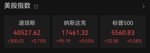 截至收盘,道指涨0.75%,报40527.62点,标普500指数涨0.58%,报5560.83点,纳指涨0.55%,报17461.32点。
