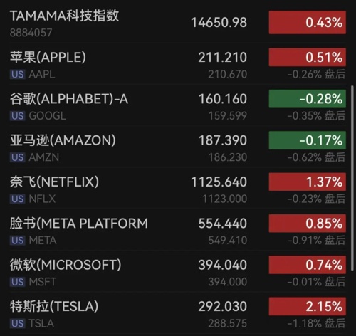 大型科技股多数上涨,特斯拉涨超2%,脸书涨0.85%,微软涨0.74%,苹果涨0.51%,英伟达涨0.27%,亚马逊跌0.17%,谷歌跌0.28%。