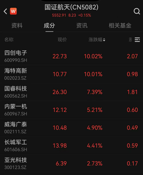 5月22日上午,军工板块再度反弹,航空航天板块表现活跃。截至当日收盘,国证航天指数上涨0.15%,其中,四创电子、海特高新涨停,国睿科技、内蒙一机、威海广泰等涨幅较多。