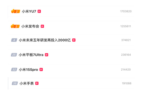 当晚,“小米发布会”“小米未来五年研发再投入2000亿元”“小米YU7”等多个话题相继冲上微博热搜。