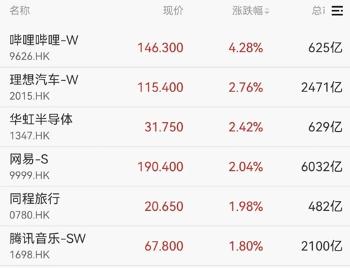港股方面,三大指数悉数走高,哔哩哔哩涨超4%,理想汽车、华虹半导体、网易等跟涨。