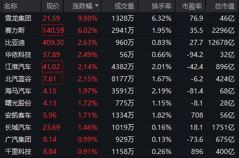 汽车整车股震荡拉升,比亚迪续创历史新高,雪龙集团涨停,赛力斯、江淮汽车、北汽蓝谷等跟涨。